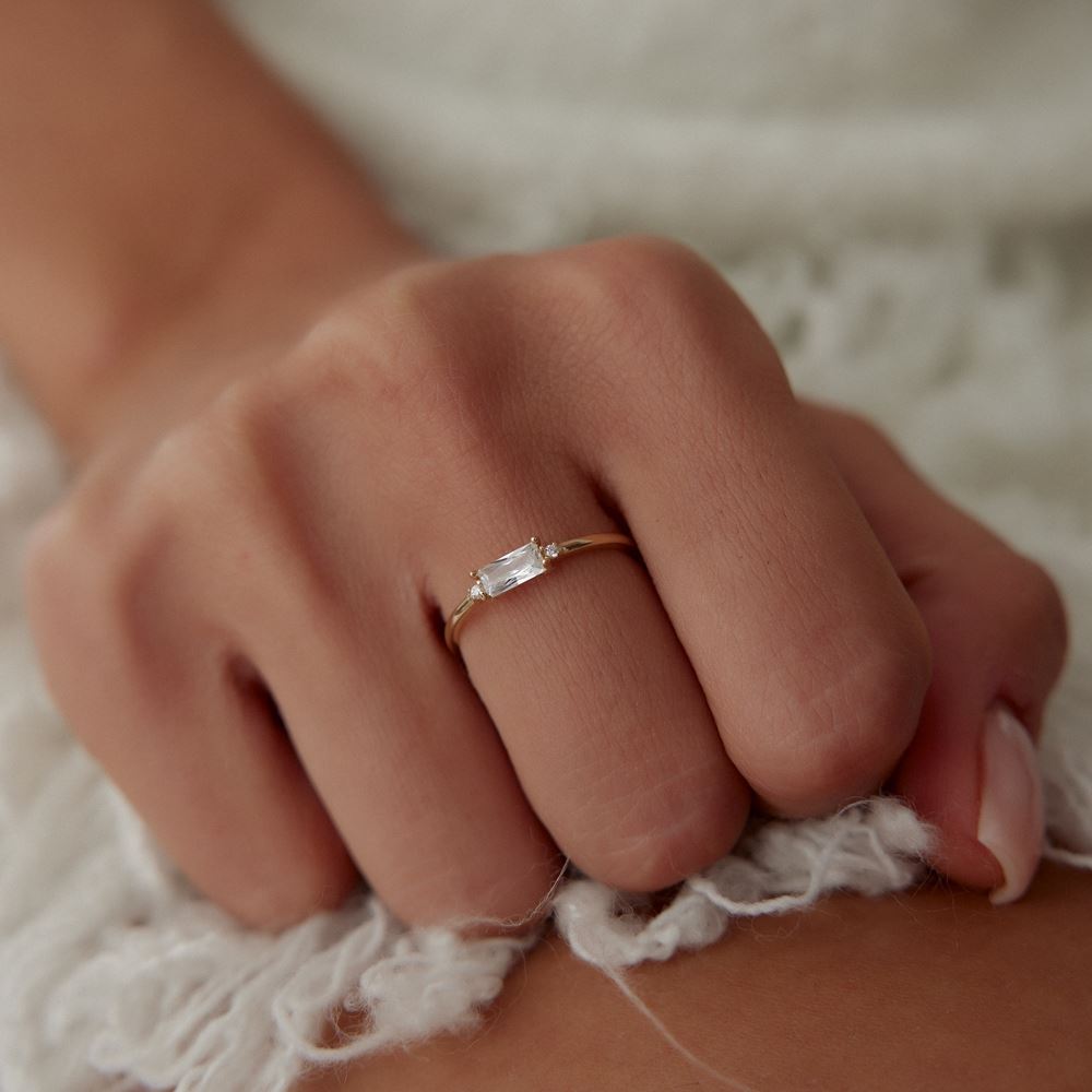 Baget Taşlı Tasarım Yüzük, zarif baget taş detayıyla parmaklarınızda sofistike ve modern bir duruş sağlar. 14 ayar altın işçiliği ile estetik ve göz alıcı bir stil sunar, kendiniz için veya sevdiklerinize anlam dolu ve kalıcı bir hediye olarak idealdir.
