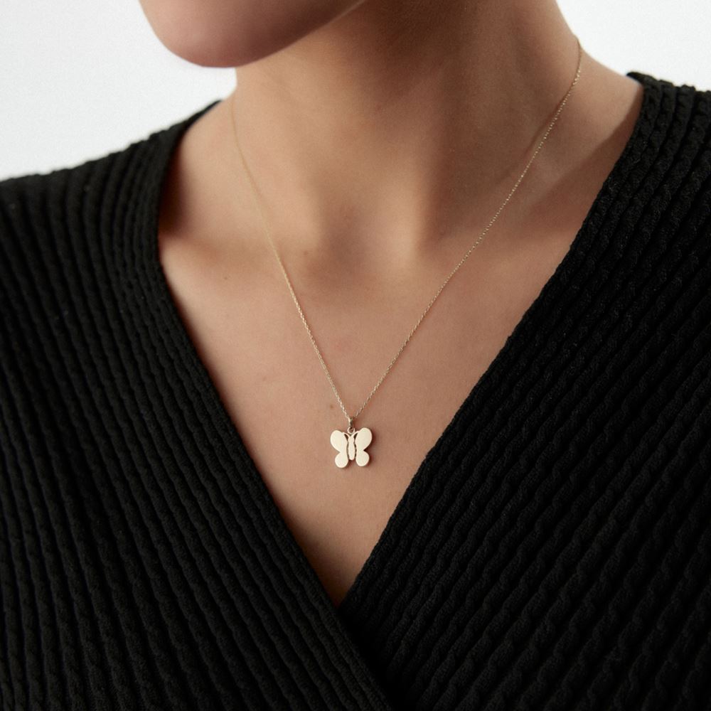Kelebek Kolye, özgürlük ve zarafeti temsil eder. 14 ayar altın işçiliği ve minimal taş detaylarıyla modern ve sofistike bir görünüm kazandırır. Kendiniz veya sevdikleriniz için anlamlı ve şık bir hediye alternatifi sunar.