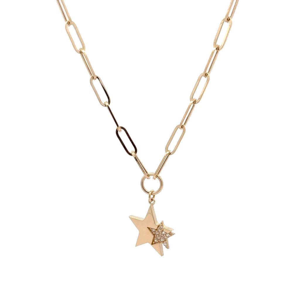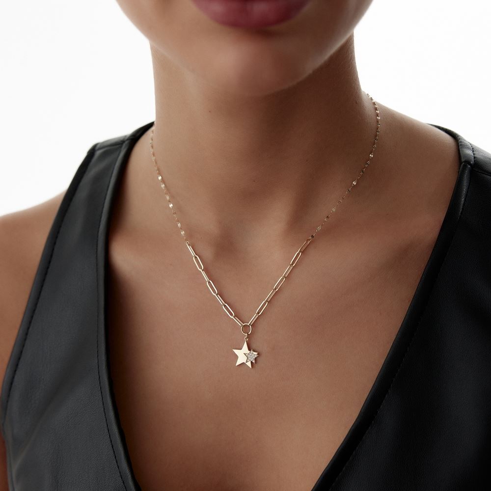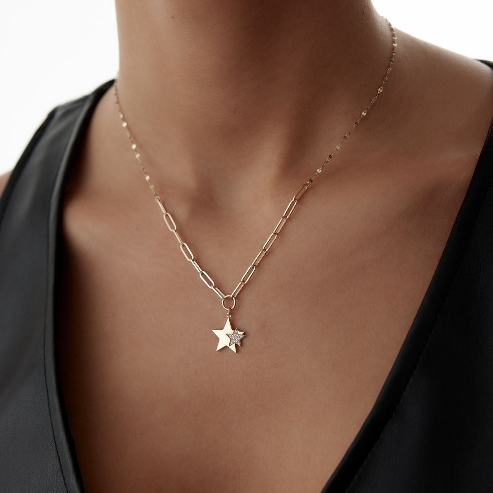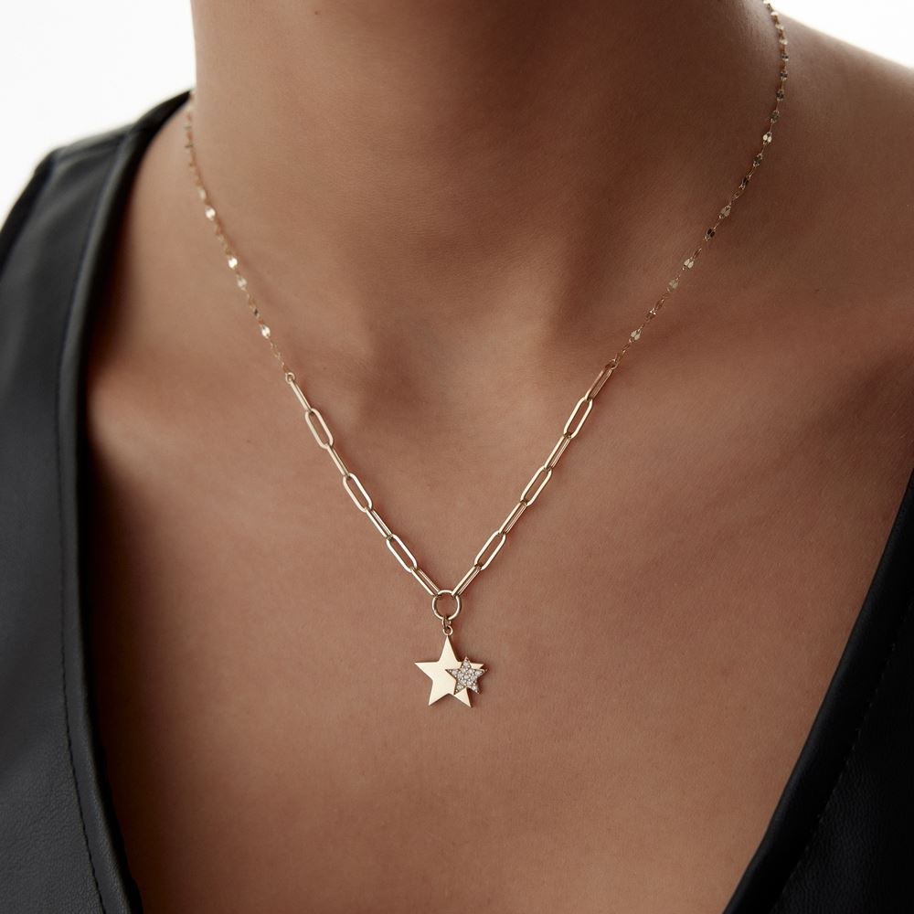 Yıldız İçinde Yıldız Taşlı Kolye, çift yıldız tasarımı ve taş detaylarıyla boynunuzda sofistike ve göz alıcı bir duruş sağlar. 14 ayar altın işçiliği, estetik ve modern bir stil sunar. Kendiniz için boynunuza zarafet katabilir veya sevdiklerinize anlam dolu ve kalıcı bir hediye olarak sunabileceğiniz özel bir parçadır.